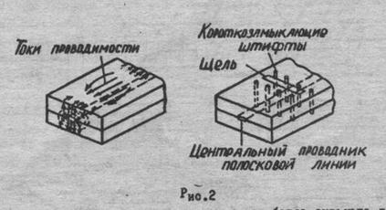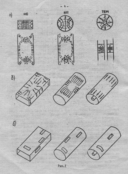 где На рис.1,а приведены эпюры распределения электрического (сплошные линии) и магнитного (пунктирные) полей некоторых типов волн в фидерах, на рис.1,б - токи проводимости на внутренних поверхностях фидеров, на рис.1,в показано, как следует располагать щели с максимальной интенсивностью излучения (незаштрихованные) и неизлучающие (заштрихованные). На рис.2,а изображена электромагнитная волна в симметричной полосковой линии, а на рис.2,б - щелевой излучатель, прорезанный во внешнем проводнике этой линии. Наличие щелей вызывает появление в полосковой линии волн высших типов, для подавления которых используется комбинация короткозамыкающих штифтов. Щели можно