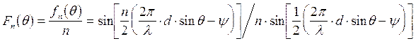 Значение n определяет главный максимум диаграммы направленности, который ориентирован в направлении, перпендикулярном линии расположения излучателей. Это значение в n раз больше, чем напряженность поля, создаваемого одиночным излучателем в любом направлении, что следует из (3) при n=1. В направлении максимума диаграммы все напряженности полей отдельных излучателей складываются в одинаковой фазе, т.е. арифметически. Подобные