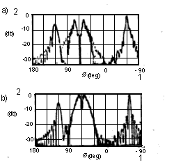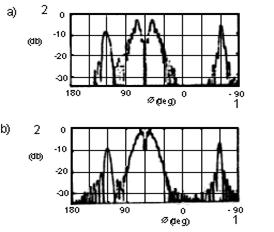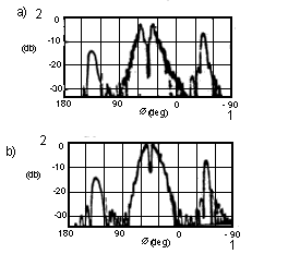 Рис.9. Рассеянная на проводнике волна: а) - результаты измерений (алюминий); b) - результаты расчетов (идеальный проводник); 1 - Æ (град.); 2 - (дБ).