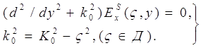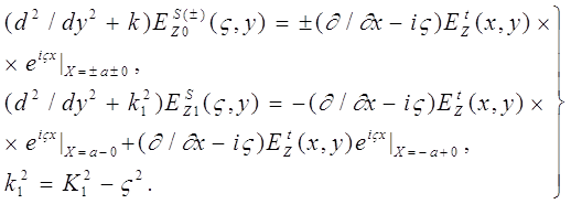 у неизвестной функции С другой стороны, при | y | £ b существует разрыв в среде. В результате выполнения прямого преобразования Фурье в волновом уравнении (3) оно превращается в следующие дифференциальные уравнения неодинакового порядка: