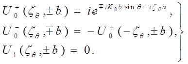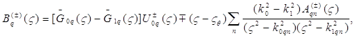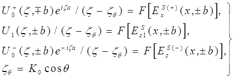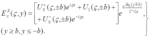 Смысл индексов, которыми снабжены каждая из электромагнитных волн, как видно из формул (6), определяющих эти электромагнитные волны, заключается в следующем. Нижний индекс «0»соответствует тому, что поле удовлетворяет волновому уравнению в вакууме, а индекс «1» - тому, что поле удовлетворяет волновому уравнению в среде с потерями. Другими словами, эти индексы соответствуют значениям индекса j=0, 1 в уравнениях (3). Кроме того, верхний значок (+) указывает на то, что данное поле имеет смысл только при x >a, а значок (-) - на то, что рассматриваемое поле имеет смысл только при x <-a. В силу этих определений делаются особенно ясными аналитические свойства Фурье-компонент каждой электромагнитной волны и становится возможным выполнение исследования, основанного на теоретико-функциональных рассуждениях. Найдем теперь Фурье-компоненты рассеянной волны. Прежде всего посредством перехода к прямому преобразованию Фурье в волновом уравнении (3) при | y | ³ b можно получить следующее уравнение: Решение этого уравнения, удовлетворяющее граничным условиям (В1), (В2), может быть записано следующими образом: