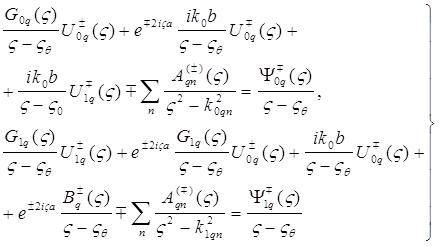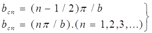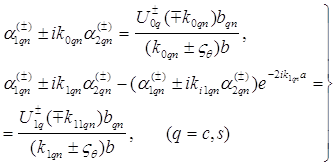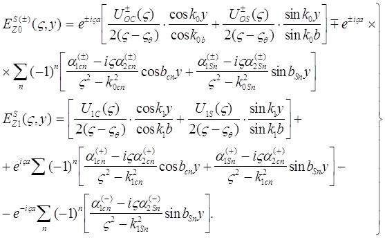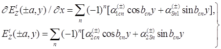 Что касается соотношений (14), то они превращаются в специальный способ разложения в ряд Фурье. Иначе говоря, представляют собой разложения по системе ортогональных функций, превращающихся в нуль при | y | =b. Физически они представляют собой собственные колебания плоскопараллельного волновода. Достаточность таких разложений будет видна из обсуждения свойств регулярности, о которых речь идет ниже. Окончательно, в качестве решения уравнений (12), удовлетворяющих граничным условиям (В2), (В3), можем записать следующие выражения :