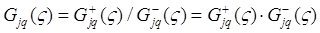 образом. Ясно, что с первого взгляда можно заключить, что особенностью функции Что касается системы уравнений Винера-Хопфа, представленной формулой (24), то ее решение можно найти, выполняя интегрирование вдоль разрезов от точек ветвления в разложениях керн-функций на множители. При выполнении расчетов возникают определенные затруднения, однако вывод решений проводится автоматически. Сначала выполняем разложение керн-функций на частное (произведение) функций, регулярных в верхней полуплоскости и в нижней полуплоскости, и, сверх того, не имеющих нулей (j=0, 1, q= c, s ): Затем, делим
