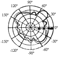b) - результаты расчетов (при В качестве второй причины можно считать то обстоятельство, что описанная экспериментальная система не является вполне двухмерной моделью. В экспериментах в качестве параллелепипеда используется тело конечной длины (1 м.), установленное на подставке; это приводит к тому, что нельзя пренебрегать влиянием волны, отраженной от подставки. Эти влияния проявляются в заметной интерференции измеренных значений при 10° - 110°. В качестве других причин можно отметить, что рассеянная волна в формуле (33) представляет собой величину, полученную применением просто метода перевала, вряд ли являющуюся хорошим приближением. Для изучения различий между бетоном и проводником на рис.9 приводится пример результатов для случая , когда рассеивающее тело заменено на проводник с теми же параметрами, что и на рис.8. Измеренные значения относятся к случаю алюминиевой пластины толщиной 1 мм., изготовленной для параллелепипеда, а рассчитанные значения относятся к случаю идеального проводника. И в этом примере обнаруживается, что измеренные значения для отраженной волны и рассчитанные значения хорошо согласуются. Кроме того очевидно, что предположение о том, идеальным проводником является даже алюминиевая пластина, оказывается достаточно правильным. Наконец, сравнивая рис.8, 9, можем заключить, что подавление отраженной волны наблюдается в среде с большими потерями. Это заключение совпадает с заключением, сделанном на основании рис.5, 6. На рис.10 представлены результаты, которые относятся к случаю, когда ширина равна ширине рассеивающего тела, приведенной на рис.8, а толщина в два раза меньше; угол падения выбран равным 45°. Очевидно, что в той мере, насколько мала толщина, отраженная волна в направлении j= 135° слабее волны, отраженной под углом j= -45°. И в этом примере измеренные значения для отраженной волны хорошо согласуются с рассчитанными значениями.