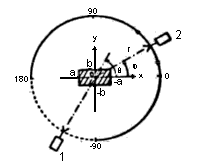 Рис.7. Оборудование для измерения рассеянной волны: 1 - передатчик (излучающая антенна); 2 - приемник (приемная антенна) То обстоятельство, что при выполнении сравнения экспериментальных результатов и результатов численных расчетов следует соблюдать определенную осторожность, связано с тем, что в экспериментах происходит интерференция падающей и рассеянной волн позади рассеивающего тела и измерение только рассеянной волны с технической точки зрения сопряжено со значительными трудностями. Одним из методов является выполнение сравнения только с отраженной волной. Однако, в данной работе в качестве одной из попыток решено провести сравнение с волной, которая получается в результате умножения падающей плоской волны на весовую функцию: При этом функция f(j) представляет собой функцию, которая зависит от приемопередающих характеристик измерительной системы, а именно от угла, под которым происходит прием в электрическом поле принимаемых сигналов приемной антенной при отсутствии рассеивающего тела. В данной работе используется аппроксимация этой функции тригонометрическими функциями так, чтобы при отклонении от точки на одной прямой с передающим рупором больше, чем ± 30° происходило ослабление на - 20 дБ. На рис.8