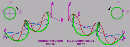 Рис. 1. Винтовая асимметрия электромагнитного поля. Для исследования всех проявлений электромагнетизма уравнений Максвелла явно недостаточно. Поэтому электродинамика Максвелла должна быть существенно дополнена. Особый интерес представляет исследование полевых структур с параллельными векторами Е и Н. Это же подчеркивает в своих работах В. Е. Жвирблис [11], отмечая, что еще Пастер и Кюри указывали на существование комбинаций электрического и магнитного полей отличных от Е Н. По нашему мнению, проблемы биологически безопасной электроники должны решаться с акцентом на эти новые особенности полей. Видно, что только на основе уменьшения энергии полей эту проблему решить не удастся. Необходимо учитывать структурные особенности электромагнитных полей. Качественное отличие полей мы называем левовинтовым и правовинтовым полями. К выводу о существовании левовинтовых и правовинтовых полей привели исследования в области теории физического вакуума и выявленные закономерности в структурогенезе вещества [9,10,12]. Левовинтовая и правовинтовая асимметрия являются определяющими для полевых систем, поскольку с ними связаны нарушения симметрии в природных структурах и явлениях. Генерируемые техническими системами электромагнитные поля имеют антиприродную структуру. На наш взгляд, именно в этом кроется причина их чрезвычайно высокой опасности для живых организмов даже в том случае, когда их уровень значительно ниже уровня естественных электромагнитных полей. Впервые мы выходим на принципиально новый аспект проблемы – учет структурных особенностей полей. Геометрия полей выходит на первый план, оставляя позади себя энергетический фактор. 3. Винтовая асимметрия в природе Спирали и винтовые поверхности являются неотъемлемыми признаками и атрибутами для многих природных конструкций и явлений. Так на макро уровне в структурах Вселенной (Рис.2) наблюдаются спиралевидные образования. К ним можно отнести винтовые расположения звездных скоплений в спиральных туманностях и тенденцию галактик к скручиванию. Эти проявления являются важнейшими структурными особенностями Вселенной.