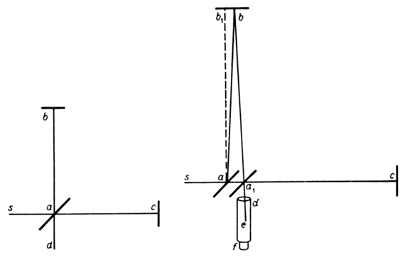 Рис. 1. Схема интерферометра Майкельсона Пусть sa (рис.1а) – луч света, который частично отражается по аb, а частично проходит по ас и возвращается зеркалами b и c по ba и ca. Луч ba частично пропускается по ad, и са частично отражается по ad. Тогда, если пути аb и ас равны, два луча интерферируют вдоль ad. Предположим теперь, что эфир находится в покое, а весь прибор движется в направлении sc со скоростью движения Земли по орбите. Направления и расстояния, проходимые лучами, изменяются так. Луч sa отражается по аb (рис.1б), причем угол bab1 равен углу аберрации α, возвращается по ba1 (aba1 = 2α) θ попадает в фокус зрительной трубы, направление которой не меняется. Пропущенный луч идет по ас, возвращается по са и отражается в а1, образуя угол са1е. равный 90° – α, и поэтому все-таки совпадает с первым лучом. Можно отметить, что теперь лучи ba1 и са1 не встречаются в точности в одной и той же точке а1, хотя разность составляет величину второго порядка малости; это не влияет на справедливость рассуждений. Пусть теперь требуется найти разность двух путей света аbа1 и аса1. Пусть V – скорость света; v – скорость движения Земли по орбите; D – расстояние аb или ас; Т – время, которое требуется свету для прохождения от а до с, Т1 – время, необходимое свету для возвращения от c к а1 (рис.1а). Тогда Т = D / (V – v), Т1 = D / (V + v). Полное время движения туда и обратно равно T + T1 = 2D · V / (V2 – v2), и расстояние, пройденное за это время, равно 2D · V2 / (V2 – v2) ≈ 2D · (1 + v2/V2), если пренебречь членами четвертого порядка. Длина другого пути, очевидно, равна