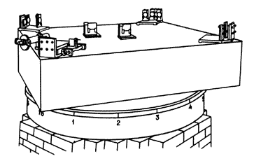 Рис. 2. Внешний вид интерферометра Вид прибора показан на рис.2, его вертикальное сечение – на рис.3, а ход лучей в нем – на рис.4. Камень а (рис.4) имел площадь около 1,5х1,5м и толщину 0,3м. Он покоился на кольцеобразном деревянном поплавке bb с внешним диаметром 1,5м, внутренним диаметром 0,7м и толщиной 0,25м. Поплавок располагался на ртути, содержавшейся в чугунном лотке cc толщиной 1,5см и таких размеров, что вокруг поплавка в нем оставалось свободное пространство около сантиметра.