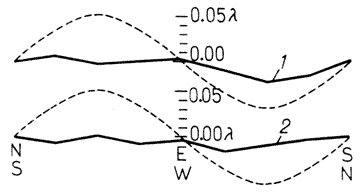 Таблица дают среднее шести отсчетов: для наблюдений, выполненных около полудня и для наблюдений около шести часов вечера. Отсчеты – это деления головки винта. Ширина полос менялась от 400 до 60 делений, причем среднее значение составляло около 50, так что одно деление означает 0,02 длины волны. При полуденных наблюдениях вращение производилось против часовой стрелки, при вечерних – по часовой стрелке. Результаты наблюдений представлены графически на рис.5. Кривая1 соответствует полуденным наблюдениям, кривая2 – вечерним. Пунктирные линии показывают одну восьмую теоретического смещения1. Из рисунка возможно сделать вывод о том, что если и существует какое-либо смещение благодаря относительному движению Земли и светоносного эфира, оно не может быть значительно больше, чем 0,01 расстояния между полосами.