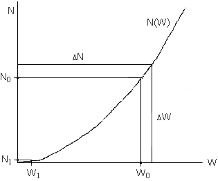 Тот же результат для R можно, разумеется, получить и из выражения для тепловых потерь, не используя уравнение движения заряда (6) I2R=∆NSLn, воспользовавшись выражением (4) для ∆N и формулой I=enUS. В принципе, на этом можно и завершить данную тему, однако интересно было бы рассмотреть, какой вид могла бы иметь функция N(W). Например, мощность циклотронного излучения обычно определяют по формуле