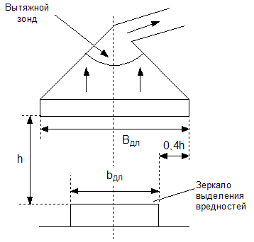 Рис. 11.3. Примерная схема вытяжного зонта. Объем удаляемого воздуха, м3/ч определяется по формуле: G30HT =3600* FЗОНТ * VЗОНТ где FЗОНТ - площадь приемного отверстия; VЗОНТ - средняя скорость воздуха в приемном отверстии зонта, м/с 11.6. Расчет геометрических длин воздухозаборника. Проведем расчет сторон колпака зонта. Зеркало выделения вредностей при выполнения монтажных и сборочных работ в нашем случае имеет прямоугольную форму и не превышает следующих размеров: длина bДЛ - до 0,5м, ширина bШ - до 0,3 м и высота - до 0,2 м. Расстояние h от поверхности источника выделения до приемного отверстия колпака определяется удобством работы и равно 1,5 м. Отсюда получаем, что длина и ширина колпака зонта: ВДЛ=bДЛ +2* 0,4* b=0,5+2* 0,4* 1,5=1,7 м ВШ= bШ +2* 0,4* b=0,3+2* 0,4* 1,5=1,5 м Для расчета QЗОНТ необходимо определить FЗОНТ площадь приемного отверстия зонта: FЗОНТ = ВДЛ * ВШ =1,7* 1,5=2,55м2. Проведем расчет GЗОНТ, результаты запишем в таблицу 11.1. Таблица 11.1.