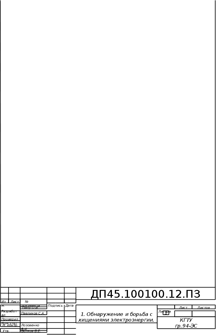 КАЛИНИНГРАДСКИЙ ГОСУДАРСТВЕННЫЙ ТЕХНИЧЕСКИЙ УНИВЕРСИТЕТ КАФЕДРА ЭЛЕКТРООБОРУДОВАНИЯ СУДОВ И ЭНЕРГЕТИКИ Заведующий кафедрой Допущен к защите канд. техн. наук, доцент Декан факультета ___________ Волков В.Е. судостроения и энергетики канд. техн. наук, доцент ____________ Селин В.В. ДИПЛОМНЫЙ ПРОЕКТ ОБНАРУЖЕНИЕ И БОРЬБА С ХИЩЕНИЯМИ ЭЛЕКТРОЭНЕРГИИ По специальности 100100 «Электрические станции» Пояснительная записка ДП 45.100.100.12 ПЗ Нормоконтролер Руководитель проекта: доцент канд. техн. наук, доцент ___________ Лозовенко В.И. _____________ Павликов С.А. Консультанты: по безопасности Проект выполнил жизнедеятельности студент группы 94-ЭС ст. преподаватель _____________ Папу О.И. ___________ Ильюша Р.Ф. по экологии доктор биолог. наук, профессор ___________ Шкицкий В.А. по экономике канд. эконом. наук, доцент ___________ Паршина Л.П. по ЕСКД доцент ___________ Лозовенко В.И. КАЛИНИНГРАД 1999 |