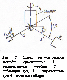 Для ориентации рентгеновским способом используют установки УРС-50И, УРС-60, УРС-70К1. Универсальная установка УРС-50И с приставкой ЖК 78.04 предназначена для определения ориентации в кристаллографической плоскости (111). Максимальный угол отклонения кристаллографической плоскости (111) от торца слитка Si, который можно определить на данной установке, составляет 14°, а для слитков Ge — 13°. Точность ориентации на данной установке ± 15´, время ориентации 10—15 мин. На рис. 7 представлена схема рентгеновского метода ориентации. При ориентации слитка кремния для нахождения, например, кристаллографической плоскости (111) рентгеновскую трубку располагают под углом 17˚56΄ к плоскости торца слитка. Если торец слитка совпадает с заданной кристаллографической плоскостью (111), то счетчик Гейгера, расположенный под углом 2θ к падающему рентгеновскому пучку в плоскости падения, зафиксирует максимум отраженных лучей. Если торец слитка не совпадает с кристаллографической плоскостью, то для получения максимальной интенсивности отраженных лучей слиток поворачивают вокруг вертикальной оси по отношению к плоскости рисунка на определенный угол α, одновременно вращая его относительно оси, нормальной к плоскости торца. Угол отклонения α плоскости торца слитка от кристаллографической плоскости (111) определяют по шкале гониометра установки и записывают в паспорт слитка. На торце слитка проводят стрелку, направление которой указывает, в какую сторону от торца слитка отклонена кристаллографическая плоскость (111).