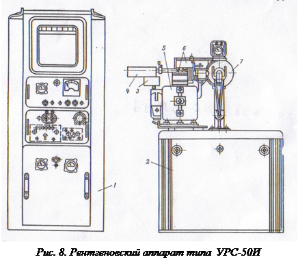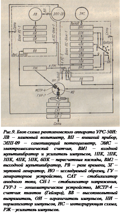 Блок схема рентгеновского аппарата УРС-50И приведена на рис. 9 (см. приложение 2). Установка соединена с сетью через входной стабилизатор напряжения СН-1 высокой точности. Генераторное устройство предназначено для питания рентгеновской трубки высоковольтным напряжением. Блок ПС-64М-1 преобразует импульсы для нормальной работы электромеханического счетчика. При работе аппарата рентгеновские лучи, выходящие из окна рентгеновской трубки, попадают на исследуемый образец, находящийся вместе со счетчиком рентгеновских квантов МСТР-4 (РМ-4) на гониометрическом устройстве ГУР-3. Лучи, отраженные под некоторым углом от образца, попадают на счетчик рентгеновских квантов, представляющий собой газовый конденсатор в стеклянной оболочке с тонким слюдяным оконцем в торце, наполненный смесью аргона и метилаля. Счетчик представляет собой цилиндрический газовый конденсатор, состоящий из металлической тонкостенной трубки, вдоль оси которой протянута металлическая нить. Между центральной нитью и обкладкой счетчика прикладывается напряжение 1300-1500 В от высоковольтного выпрямителя (ВВ) блока РЕ-1, и достаточно появления в счетчике в результате ионизационного действия рентгеновских лучей одной пары ионов (электрона и положительного иона), чтобы счетчик сработал, т.е. чтобы через него прошел единичный импульс тока длительностью 200мс. Количество импульсов тока, возникающих в счетчике в единицу времени, пропорционально интенсивности отраженного рентгеновского пучка. Монокристаллические слитки кремния и германия ориентируются с помощью специальной приставки (см. рис. 10 на приложении), состоящей из блока вращения и электрического блока управления. Блок вращения устанавливается на гониометре. С его помощью слиток прижимается к базовой поверхности и вращается в ручную или от электродвигателя относительно горизонтальной оси. Гониометрическое устройство позволяет вращать счетчик или образец независимо друг от друга или вместе. Вращение можно осуществлять с разной скоростью. Гониометрическое устройство дает возможность производить точный отсчет углов относительно первичного пучка лучей, производящих ионизацию в счетчике квантов. Возбуждаемые в счетчике квантов импульсы тока, проходя через резисторы, преобразуются в импульсы напряжения, которые затем усиливаются в блоке РЖ (усилителя импульсов) и передаются по кабелю на вход мультивибратора блока ПС-64М-1. В первом каскаде этого блока различные по длительности, форме и амплитуде импульсы формируются в очень короткие (порядка 50 мс) прямоугольные импульсы напряжения одинаковой амплитуды. После этого каждый импульс идет по двум путям: к пересчетному устройству и к измерителю скорости счета. Пересчетное устройство состоит их шести каскадов, каждый из которых пропускает один импульс из двух, поступающих на его вход. Импульс от соответствующего пересчетного каскада, подключенного к застопоренному выходному мультивибратору, запускает данный мультивибратор, назначением которого является формирование импульсов напряжения длительностью порядка 5 мс. На выходе пересчетного устройства, изменяя количество подключенных каскадов мультивибраторов, можно получить один импульс от 2, 4, 8, 16, 32 или 64 импульсов, подающихся на вход. Эти импульсы запускают усилитель тока, на выходе которого получаютс