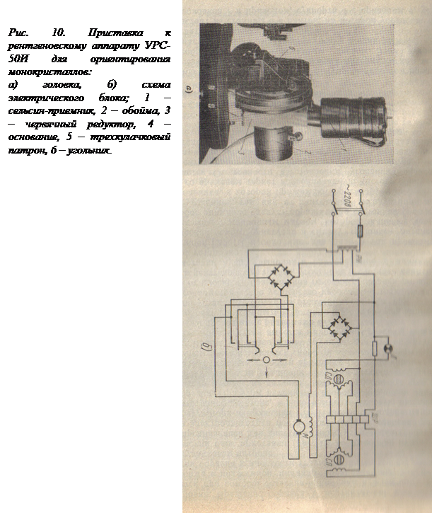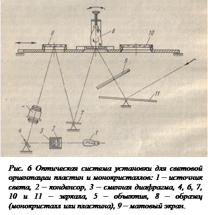 двух линз), сменную диафрагму 3 (величина которой ступенчато регулируется) на зеркало 4. Отразившись от зеркала 4, луч света проходит через объектив 5 (типа «Юпитер 11» с фокусным расстоянием 135 мм), а затем, последовательно отразившись от зеркал 6 и 7 и образца 8 попадает на матовый экран 9. Изображение световой фигуры, которое образуется на матовом экране, рассматривают через смотровое окно с помощью зеркала 11. Зеркала 6 и 10 укреплены на подвижной плите. На рис. 6 показано положение зеркал 6 и 10, когда подвижная плита находится в крайнем переднем положении. При таком положении подвижной плиты пользуются зеркалом 6; расстояние от образца до экрана по ходу луча равно 114,5 мм. Одно деление шкалы экрана в этом случае соответствует отклонению кристаллографической плоскости на 15´. При крайнем заднем положении подвижной плиты место зеркала 6 занимает образец, а место образца— зеркало 10. Расстояние от образца до экрана по ходу луча при этом равно 572 мм, а одно деление шкалы экрана соответствует отклонению кристаллографической плоскости на 3´. То есть цена деления экрана для германиевых образцов (подвижная плита находится в крайнем переднем положении) равна 15´, а цена деления шкалы экрана для кремниевых образцов (подвижная плита находится в крайнем заднем положении) равна 3´. Элементы оптической системы установки можно регулировать. Лампа накаливания, являющаяся источником луча света, установлена на подвижной каретке и может передвигаться по направляющим, занимая инициальное положение относительно конденсора. Кроме того, изменяя положение лампы, можно регулировать направленность светового луча. Положение конденсора относительно лампы и диафрагмы также можно регулировать. Нижнее зеркало 4 и верхнее зеркало 7 можно поворачивать вокруг осей, устанавливая требуемое положение соответствующими ручками и фиксируя это цанговыми зажимами. Фотообъектив закреплен в специальной подставке. Устанавливают диафрагму объектива и фокусируют его, вращая ручки, которые зубчатыми парами поворачивают соответствующие детали объектива. Экран 9 состоит из жесткой рамки, поворачивающейся на оси, матового стекла и органического стекла, на которое нанесена шкала. Для создания хорошей видимости шкала подсвечивается двумя электрическими лампочками. Экран закреплен на оси в подвижной каретке; ручкой каретку, а, следовательно, и экран можно перемещать по шариковым опорам в направлении хода светового луча. Перемещается экран механизмом подъема, в котором имеется самотормозящая червячная пара, сохраняющая установленное положение экрана. Фокусируют экран при повороте, вращая ручку, воздействующую на цанговый зажим. Зеркало 11 может быть установлено в удобное для наблюдения положение вращением ручки и зафиксировано цанговым зажимом. В электрический блок, расположенный в передней стенке корпуса установки, входят понижающий трансформатор, лампы и потенциометры для регулирования подаваемого напряжения, а также тумблер, сигнальная лампа и плата, к которой подводится питание от сети.