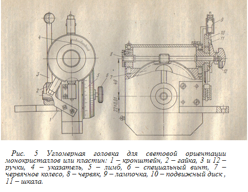 Техническая характеристика установки ЖК 78.08: Размеры слитков, мм: максимальный диаметр ............... 60 длина ............................................... 80 Минимальный размер пластин (кристаллов), мм .................................................... 1,5х1,5 Точность ориентации: кремния ........................................... ±3´ германия ......................................... ±15´ Цена деления шкалы экрана: для кремния ................................... 3´ для германия ................................. 15´ угломерной головки .................... 1´ Источник света (лампа накаливания), Вт .................................................... 30 Применяемая энергетика (сеть переменного тока): напряжение, В .............................. 220 частота, Гц ................................... 50 Габаритные размеры, мм .......... 575х288х550 Масса, кг ...................................... 35 Угломерная головка (рис. 5) состоит из червячного редуктора, у которого на червяке 8 имеется ручка 12 с указателем 4, а на червячном колесе 7 – лимб 5. Указатель на ручке, закрепленной на червяке, указывает угол поворота образца (угол отклонения кристаллографической плоскости) по шкале 11, закрепленной на подвижном диске 10. Лимб, посаженный на вал червячного колеса, можно вращать независимо от вращения червячного колеса или совместно с червячным колесом, если застопорить лимб специальным винтом 6, ввернутым в торец вала. Вал червячного колеса с конца, противоположного лимбу, имеет цангу, которая с гайкой 2 образует цанговый зажим, приводимый в действие ручкой 3. Цанговый зажим предназначен для жесткого соединения вала детали, имеющей безировочную плоскость, с угломерной головкой. Для подсветки шкалы и лимба имеются две электрические лампочки 9. Шкала предназначена для отсчета углов отклонения кристаллографических плоскостей, не превышающих двух градусов, а лимб – свыше двух градусов. Крепится угломерная головка к подвижной плите кронштейном 1. Оптическая система установки (рис. 6) состоит из источника света, конденсатора, зеркал, объектива, диаграммы и экрана. Луч света в оптической системе проходит от источника света 1 (лампа накаливания СЦ-68 8 В, 30 Вт) через конденсор 2 (представляющего собой систему