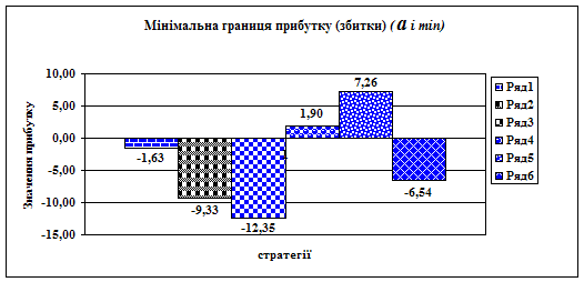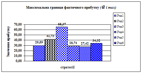 За цією таблицею ми можемо бачити зміни граничних інтервалів ефективності стратегій: ai max характеризує максимальну границю інтервалу ефективності, тобто очікувані прибутки. Тут кращою є 3 стратегія. ai min характеризує мінімальне значення інтервалу ефективності, якщо воно є від’ємним тоді ми можемо бачити розмір втрат, виходячи з цього вигіднішою є 5 стратегія, так як вона є не збитковою і має найбільше додатне значення.