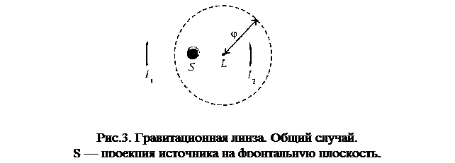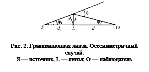 Однако такая наивная оценка просто неверна. Это следует, в частности, из исследования простейшего случая соосного расположения источника S, линзы L и наблюдателя O (рис. 2). Задача эта была рассмотрена в 1924 году Хвольсоном (профессор Петербургского университета, автор пятитомного курса физики, широко известного в начале века) и спустя 12 лет Эйнштейном. Обратимся к ней и мы. Ясно, что для всякого расстояния d1 между источником и линзой, d — между линзой и наблюдателем для любого гравитационного радиуса rg линзы (звезды или скопления звезд) найдется такое минимальное расстояние ρ между лучом из источника и линзой, при котором этот луч попадает в приемник. При этом изображения источника заполняют окружность, которую наблюдатель видит под углом φ Углы φ и θ1 малы, так что φ=h/d,φ1=h/d а, кроме того, h=ρ Отсюда легко находим С другой стороны, для θ справедлива, очевидно, формула (8). Таким образом, И наконец, интересующий нас угол составляет