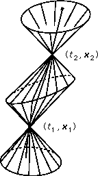 Рис. 7 Если частицы движутся только вдоль оси 0x, то наглядно представить "Мир Минковского" можно с помощью плоскости координат (с t, x). Время удобно умножить на скорость света, чтобы обе координаты имели одинаковую размерность. Это можно сделать, поскольку скорость света - универсальная мировая константа.