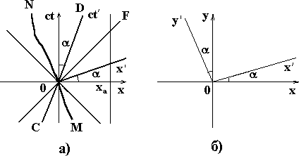 Рис. 8 Мировыми линиями (в отличие от траекторий классической механики) обладают не только движущиеся, но и покоящиеся в данной инерциальной системе отсчета тела. Так, мировая линия тела, покоящегося в начале координат, будет совпадать с временной осью 0 ct, а тела, покоящегося в пространственной точке xa - является прямой AB, параллельной оси времени. Мировая линия тела, движущегося с постоянной скоростью V - (и при t = 0, находящегося в точке x(0) = 0) - прямая CD; мировая линия светового луча, испущенного из начала координат в напралении оси x - биссектриса координатного угла OF; мировая линия тела, движущегося с переменной скоростью v(t) - кривая MN (cм. Рис. 8а)) 2.6 Геометрический смысл преобразований Лоренца Выясним теперь геометрический смысл преобразований Лоренца. Еще раз запишем его только для x и t в виде