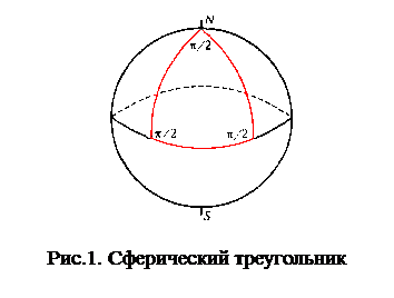 Геометрия нашего пространства оказывается неевклидовой. Некоторое представление о свойствах такого пространства можно получить на простейшем примере сферы, поверхности обычного глобуса. Рассмотрим на ней сферический треугольник — фигуру, ограниченную дугами большого радиуса. (Дуга большого радиуса, соединяющая две точки на сфере, — это кратчайшее расстояние между ними: она естественный аналог прямой на плоскости.) Выберем в качестве этих дуг участки меридианов, отличающихся на 90o долготы, и экватора (рис. 1). Сумма углов этого сферического треугольника отнюдь не равна сумме углов π,треугольника на плоскости: