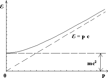 . Эта зависимость энергии от импульса изображена на Рис. 10. При малых значениях импульса E = m c2 + p2/2 m, а при достаточно больших импульсах E = p c. Иногда формулу (21), записывают в виде E = m(v) c2, вводя "релятивистскую массу" частицы, зависящую от скорости:
