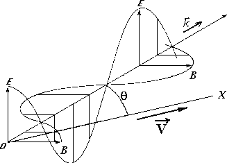 Рис. 11 Выясним закон преобразования частоты и волнового вектора при переходе в другую инерциальную систему отсчета. Будем для определенности считать, что волна распространяется под углом к оси 0x, вдоль которой со скоростью V движется "штрихованная" система отсчета S. Из Рис. 11 видно, что существуют пространственно - временные точки, в которых векторы поля обращаются в нуль (узловые точки волны - те точки, в которых косинус равен нулю). Ясно, что это свойство поля носит объективный характер и должно выполняться во всех инерциальных системах отсчета. Отсюда следует, что фаза электромагнитной волны должна быть инвариантна!