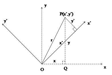 QP2=OQ2+QP2, або r2=x2+y2. Тепер введемо ще одну пару ортогональних осей координат з тим же початком, але повернутих на деякий кут по відношенню до початкової системи координат. При цьому виникає питання “Що станеться з формулою для r2, якщо її перевести з старих нештрихованих, до нових штрихованих координат?”