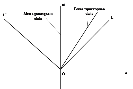 Зображаючи на папері простір Мінковського і при цьому намагаючись трактувати чотирьохвимірний інтервал s так само, як ми трактуємо відстань r в звичайній геометрії, неможливо уникнути дуже серйозних викривлень, що добре видно на прикладі двух просторових ліній OL i OL’, які складають з осями кути по 450. Горизонтальна координата х любої точки лінії OL рівна по величині вертикальній координаті ct такої ж точки, і тому вздовж OL завжди справедлива рівність х=ct. Тепер згадаємо, що світловий сигнал, який вийшов з точки х=0 в момент часу t=0 і який поширюється в додатньому напрямі осі х, пройде за час t відстань ct, рівна добутку швидкості світла с на час t, тобто є х=сt. Таким чином OL – не що інше, як просторова лінія цього світлового сигналу. Тоді OL’ – просторова лінія світлового сигналу, який поширюється в протилежному напрямі. Але якщо координата х рівна ct (а у і z залишаються рівними нулю), то з формули для s2 відразу ж слідує, що s=0. Тому інтервал між подією О і будь-якою подією чи на просторовій лінії OL, чи на просторовій лінії OL’ завжди рівний нулю, і з цим погодиться усякий спостерігач, який рухається рівномірно. Нічого не поробиш, така відмінність між рівним нулю чотирьохвимірним інтервалом і відмінною від нуля відстанню на одній і тій самій просторовій діаграмі, не відразу ж укладається в свідомості. Але нехай вас це не лякає, так як закони спеціальної теорії відносності забороняють матеріальним об’єктам, які мають масу спокою, рухатись з швидкістю світла. Для таких об’єктів, які відправляються в путь з точки О, визначена раніше величина s2 виходить від’ємна. Щоб уникнути цієї незручності, перевизначимо s2, прийнявши її рівною раніше визначеній величині, але взятій зі знаком “мінус”, і, не дивлячись на таке перевизначення, будемо всеодно s будемо називати інтервалом. Парадокс близнюків. Розглянемо відому релятивістську задачу – парадокс близнюків. Один з близнюків залишається у себе вдома на Землі, а інший відправляється в космічну подорож. Близнюк-мандрівник залишає Землю в космічному кораблі, летить з великою швидкістю, скажімо, рік, потім розвертає назад, знову летить рік у напрямку до Землі і, накінець, приземляється. В ході своєї мандрівки він постарів на два роки. Яким же є його здивування, коли він зустрівшись з своїм братом-домосідом, знаходить, що той постарів на п’ятдесят років і тепер на сорок вісім років старше за нього. Спочатку розглянемо це явище з точки зору ефекта уповільнення ходу годинника, визваного відносним рухом спостерігачів. Близнюк-мандрівник – це своєрідні біологічні часи; те саме відноситься і до близнюка-домосіда. Якщо таке порівняння вам не імпонує, то можна припустити, що близнюки мають годинники, які можуть відраховувати роки, які пройшли, і тоді ці годинники підтвердять існування суттєвої різниці їх віку. З точки зору близнюка-домосіда, годинник і процес старіння мандрівника будуть повільнішими, ніж його. Але можна заперечити, що уповільнення годинників – однакова для обох. Так як кожен з спостерігачів в праві заявити, що саме часи іншого йдуть повільніше, чим його власні. В зв’язку з цим розглянемо цю ситуацію з точки зору близнюка-мандрівника. Тепер вже він виявиться в ролі близнюка-домосіда (але його домом буде ракета), а його брат в ролі близнюка-мандрівника (космічним кораблем якого буде Земля). Тоді при 