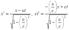 QP2=OQ’2+Q’P2, або r2=(x’)2+(y’)2. Якщо не враховувати штрихів, то формула для r в штрихованих координатах точно така ж, як і в нештрихованих. В трьохвимірному просторі можна ввести ще одну вісь z, перпендикулярну двом нашим. Повторним приміненням теореми Піфагора можна довести, що поряд з співвідношенням r2=x2+y2+z2, яке має місце в нештрихованій системі координат, виконується і співвідношення r2=(x’)2+(y’)2+(z’)2, справедливе в штрихованій системі координат, створеній трійкою взаємно перпендикулярних осей, які мають той же початок, але повернутих відносно початкових. Якщо згадати перетворення Лоренца, то неважко помітити, що вони являють собою деяке сплетіння координат x i t. Це дає підставу міркувати, що і час якось геометрично переплітається з простором. Як показує елементарний алгебраїчний розрахунок, при перетвореннях Лоренца величина s, яка визначається співвідношенням s2=x2+y2+z2-c2t2, веде себе так, що (s’)2=(x’)2+(y’)2+(z’)2-c2(t’)2. Все це, не дивлячись на с2 і знак “мінус”, дуже нагадує формули для r2 в звичайних просторах двух і трьох вимірів, що приводить до чотирьохвимірної інтерпритації нашого світу, де час виступає на рівних з простором. В такому чотирьохвимірному світі Мінковського величина s, аналогічна відстані між двума точками, називається чотирьохвимірним інтервалом між двома подіями. Точно так само, як формула для відстані r зберігає свій вигляд при перетвореннях, які описують поворот системи координат в звичайному просторі, вираз для інтервалу s зберігає свій вигляд при перетвореннях Лоренца в чотирьохвимірному просторі-часі. Цікаво, що з всього сказаного можна зробити висновок про близькість аналогії між перетвореннями Лоренца і перетвореннями, які описують поворот системи координат. Щоб вияснити, наскількі важливим є чотирьохвимірний інтервал, знову припустимо, що ми з вами знаходимся в своїх космічних ракетах, які рівномірно рухаються одна відносно одної з достатньо великою швидкістю, і ви вирішили зіграти партію в шахи. Ваш перший хід е2-е4 включає в себе дві події – підйом королівської пішки з клітинки е2 і розміщення її на клітці е4. Для вас ці події розділені приблизно 6 сантиметрами в просторі і 1 секундою в часі. Але через те, що ваша ракета рухається відносно мене з дуже великою швидкістю, дві цих події згідно моїм вимірам будуть розділені, скажімо, 1000 кілометрами в просторі і (поскільки ваш годинник, за моїми спостереженнями, відстає) приблизно 1,0000056 секунди в часі. Звідси наші погляди розходяться і за просторовим інтервалом і за часовим. Але, не дивлячись на це, якщо кожен з нас підрахує величину чотирьохвимірного інтервалу між двума подіями, виходячи тільки із своїх вимірів часу, то ми отримаємо одне і те саме значення. Після стількох розбіжностей наших вимірів так приємно знайти щось таке, в чому ми, да і всі інші, хто рівномірно рухається, були б згідні. Ясно, що величина, яка має такі унікальні властивості, як не є краще підходить для опису явищ, які проходять в чотирьовимірному просторі спеціальної теорії відносності. Ніхто не в стані уявити собі всі чотири виміри. Тому, щоб створити собі хоча б деяке уявне поняття про простір-час, як правило відкидають два з трьох просторових вимірів, розглядаючи лише ту область простору, де y i z рівні нулю (тобто вісь х), що дозволяє розглядати двовимірний простір-час з просторовою координатою 