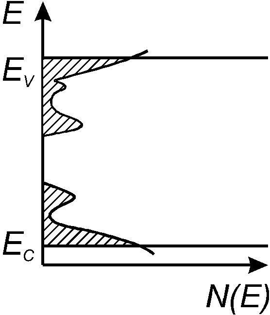 В нашем случае для получения электретов использовался метод электретирования в положительном столбе плазмы тлеющего разряда с приложением тянущего напряжения.. Отрицательные носители заряда, увлеченные полем катод—анод в направлении электретируемых образцов, оседают и накапливаются на их поверхности. Поскольку электроны обладают большими скоростями по сравнению с ионами, то они первыми попадают на поверхность образца и заряжают ее отрицательно по отношению к газу. В поле адсорбированных отрицательных частиц происходит разворот поверхностных диполей, способствующий дальнейшему накоплению и удержанию заряда. На некотором расстоянии от диэлектрической пленки в газе образуется слой положительного заряда (положительные ионы) нейтрализующий накопленный отрицательный потенциал стенки (рис.1.2). Величина отрицательного пристеночного потенциала определяется параметрами разряда, а именно кинетической энергией электронов. На поверхности диэлектрика существуют оборванные связи, цепочки, которые можно рассматривать как диполи. Под воздействием поля дипольные участки молекул на поверхности образца разворачиваются. Упругая деформации связей в молекулярных цепочках в приповерхностном объеме. Одно из возможных распределений плотности состояний в ПТФЭ
