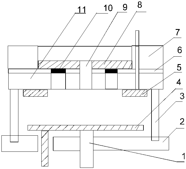 Рисунок 3.2. 1 – держатель катода; 2 – фторопластовая пластина; 3 – стеклянная труба; 4 – катод; 5 – анод; 6 – фторопластовая пленка; 7, 11 – пластины оргстекла; 8 – управляющий электрод; 9 – отверстие для затяжного винта; 10 – мембрана.