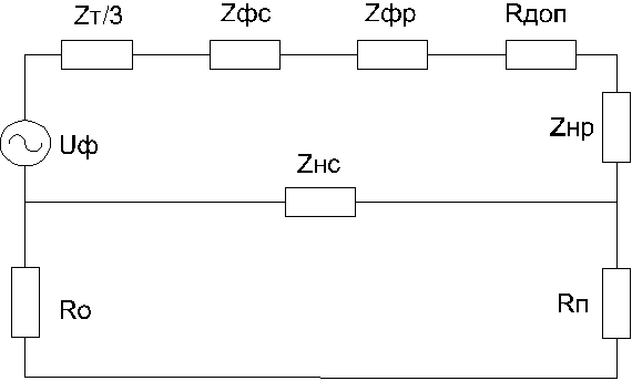 Одним из самых опасных факторов на производстве является электрический ток . Основной целью расчета является определение условий ее надежного функционирования, то есть быстрого отключения поврежденой электроустановки от сети при одновременном обеспечении безопасного напряжения на ее корпусе в течение времени от возникновения аварийной ситуации до момента отключения. Рассчитаем зануление на отключающую способность. Эквивалентная схема для расчета представлена на рис. 5.1. Рассчитаем зануление в лаборатории МЭЛ . В качестве защитного проводника используется нулевой рабочий проводник, так как все провода из алюминия, то реактивной составляющей можно принебречь [21], а следовательно все сопротивления считать активными. Zфс=Rфс, Zфр=Rфр, Zнc=Rнс, Zнр=Rнр (4.1) Величины сопротвления расчитываются по формуле: R=r*(l/s) (4.2) Где l – длинна кабеля на соответствующем участке, S – площадь его сечения . а r для алюминия равно 0,028 Ом*мм2/м [20]. Возьмем длину силового кабеля от подстанции 100 метров, длину кабеля этажной раазводки30 метров. Согласно ПУЭ, сечение жил кабелей соответственно 25 мм и 4 мм. Сопротивление фазного провода равно: Rф=Rфс+Rфр=0,028*(100/25+30/4)=0,322 (Ом) Rф=Rн=0,322 (Ом) Сопротивление петли фаза – нуль Rфн равно: Rфн=Rф+Rн+Rдоп=0,644+Rдоп (4.3) Исходя из токопотребления лабораторных установок, выбираем предохранитель с номинальным током 1 (А). Следовательно: Rдоп=0,3 Ом Rфн=0,944 Ом Определим величину тока короткого замыкания Iкз по формуле: Iкз=Uф/(Zт/3+Rфн)-1=220/(0,906+0,944)=177 (А) Zт=0,906 – сопротивление обмоток трехфазного трансформатора – взятого из таблицы [20]. При замыкании фазы на корпус электроустановка автоматически отключается, если значение тока удовлетворяет условию: Iкз>=Iном*К (4.4) Где К коэффициент кратности номинального тока плавкой вставки предохранителя. В данном случае К>3, поэтому наименьшим допустимым током Iкз должен быть Iкз min=3 А. Расчитанное значение Iкз=177 А, а следовательно, отключающая способность системы обеспечена Время выгорания предохранителя менее 0,01 с. Оценим напряжение прикосновения , возникающее при замыкании фазы на корпус: Uпр max=Uф*(Rп/(Rо+Rп)*Rнс+Rнр)/R (4.5) Где R=Rф+Rн+Zт/3+Rдоп (4.6) Rо= 4 Ом; Rп=10 Ом R=0,322+0,322+0,906/3+0,3=1,246 Ом Uпр max=9220*(10/(4+10)*0,,112+0,21))/1,246=51,2 В При данных значениях напряжения прикосновения и времени выгорания предохранителя обеспечивается защита от поражения током. . Расчетная схема электрической сети для случая замыкания одной из фаз на корпус прибора.