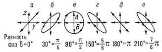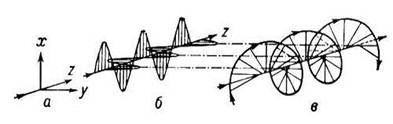 Рисунок 1.1 – Колебания проекций вектора Е световой волны в системе координат х, у, z, z – направление распространения волны (а); б и в – мгновенные изображения колебаний и соответствующей огибающей концов вектора Е в разных точках волны для случая, когда колебания Ex на четверть периода (p) опережают колебания Ey