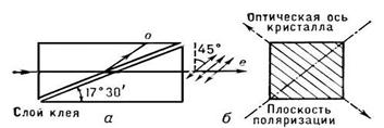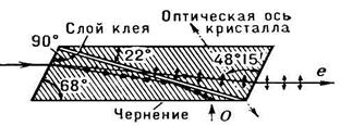 Двухлучевые поляризационные призмы пропускают обе взаимно перпендикулярно линейно поляризованные компоненты исходного пучка, пространственно разделяя их. Чаще всего их изготовляют из исландского шпата СаСОз, прозрачного в диапазоне длин волн l= 0.2¸2 мкм, и кристаллического кварца SiO2, прозрачного в диапазоне 0.185¸3.5 мкм. Призмы, из которых состоят однолучевые поляризационные призмы, склеивают прозрачным веществом с показателем преломления n»(no+ne)/2. В некоторых[ призмах их части разделены воздушной прослойкой, что снижает потери на поглощение.