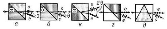 Среди двухлучевых поляризационных призм распространены также призмы Рошона, Сенармона, Волластона и некоторые др. (рисунок 2.8). Один из двух пропускаемых лучей в поляризационных призмах Рошона и Сенармона не меняет своего направления, другой (необыкновенный) отклоняется на угол q~5¸6°, сильно зависящий от длины волны света: q=(nо-ne)tga, где a - преломляющий угол трёхгранных призм. Поляризационная призма Волластона даёт удвоенный угол расхождения лучей 2q» 10°, причём при перпендикулярном падении отклонения лучей симметричны; эта поляризационная призма применяется в поляризационных фотометрах, спектрофотометрах и поляриметрах. Угол а в поляризационной призме из исландского шпата близок к 30°, из кристаллического кварца - к 60°.