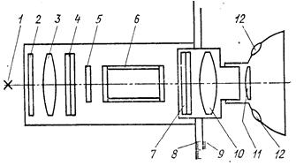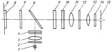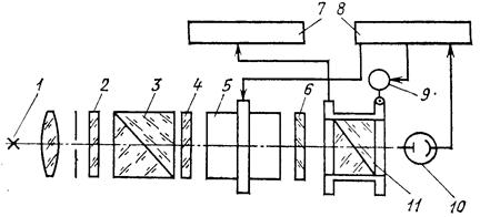 Рисунок 2.11 - Опическая схема малогабаритныого поляриметра ИГ-86 (пояснения в тексте) Источник света 1 (лампа СЦ-61) размещен в фокусе объектива 3. Защитные стекла 2, 7 и 12 предохраняют прибор от попадания в него загрязнений. Параллельный пучок лучей проходит поляризационный светофильтр (поляризатор 4), полупрозрачное зеркало 8 и, отразившись от светоделительного слоя, падает на оптически чувствительное покрытие 6, нанесенное на исследуемый объект 5. После отражения от покрытия свет попадает в анализаторный узел прибора, проходит компенсатор 9, анализатор 10 и попадает в зрительную трубу (сменное увеличение 2 и 10´) со шкалой в совмещенной фокальной плоскости объектива 11 и окуляра 13. Перед глазной линзой окуляра и выходным зрачком 15 устанавливается светофильтр 14. Такая оптическая схема получила наименование Т-образной схемы. Предел измерения оптической разности хода - от 0 до 5 интерференционных порядков. Погрешность измерения - 0.05 интерференционных порядков. Схема типичного фотоэлектрического модуляционного поляриметра, позволяющего измерять меняющуюся во времени разность фаз о- и е-лучей, показана на рисунке 2.12.