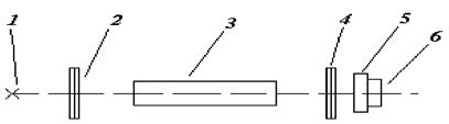 Рисунок 4 - Блок-схема экспериментальной установки: 1- источник излучения (светодиод), 2-поляризатор, 3-гнездо для кюветы с раствором оптически активного вещества, 4-анализатор, 5-шкала поворота поляризатора, 6-телескопическая система Порядок выполнения работы Приготовление растворов исследуемых веществ и подготовка к измерениям Используя лабораторные весы и мерные колбы (мензурки) приготовить требуемые серии растворов исследуемого оптического активного вещества и рассчитать их концентрацию. С помощью фильтрованной бумаги, смоченной растворителем, тщательно протереть внутреннюю часть кюветы поляриметра, после чего заполнить ее исследуемым раствором. Заполнять кювету раствором до тех пор, пока на верхнем ее конце не появится выпуклый мениск (от сдвигается в сторону при контакте с покровным стеклом). Положить на покровное стекло резиновую прокладку и все завернуть прижимной гайкой. После заполнения кюветы исследуемой жидкостью покровные стекла с наружной стороны кюветы тщательно протереть. В кювете не должно оставаться воздушных пузырей. Если же они имеются, их заводят в утолщенную часть кюветы, где они не будут мешать наблюдению.