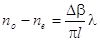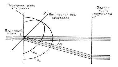 Рисунок 1.6 - Двойное лучепреломление в одноосном кристалле при перпендикулярном падении пучка света на переднюю грань кристалла Направление колебаний электрического вектора у необыкновенного луча лежит в плоскости главного сечения (проходящей через оптическую ось и световой луч), которая является плоскостью поляризации. Нарушение законов преломления в необыкновенном луче связано с тем, что скорость распространения необыкновенной волны, а, следовательно, и её показатель преломления nе зависят от направления. Для обыкновенной волны, поляризованной в плоскости, перпендикулярной главному сечению, показатель преломления nо одинаков для всех направлений. Если из точки О (рисунок 1.6) откладывать векторы, длины которых равны значениям nе и nо в различных направлениях, то геометрические места концов этих векторов образуют сферу для обыкновенной волны и эллипсоид для необыкновенной (поверхности показателей преломления). В прозрачных кристаллах интенсивности обыкновенного и необыкновенного лучей практически одинаковы, если падающий свет был естественным. Выделив диафрагмой один из лучей, получившихся при двойном лучепреломлении, и пропустив его через второй кристалл, можно снова получить двойное лучепреломление. Однако интенсивности обыкновенного и необыкновенного лучей в этом случае будут различны, т. к. падающий луч поляризован. Отношение интенсивностей зависит от взаимной ориентации кристаллов - от угла a, образуемого плоскостями главных сечений того и другого кристалла (плоскости, проходящие через оптическую ось и световой луч). Если j=0° или 180°, то остаётся только обыкновенный луч. При a=90°, наоборот, остаётся только луч необыкновенный. При a=45° интенсивность обоих лучей одинакова. В общем случае кристалл может иметь две оптических оси, т. е. два направления, вдоль которых двойное лучепреломление отсутствует. В двуосных кристаллах оба луча, появляющиеся при двойном лучепреломлении, ведут себя, как необыкновенные. Двойное лучепреломление, характеризуемое величиной и знаком Dn, может быть положительным и отрицательным; в соответствии с этим различают положительные и отрицательные (одноосные) кристаллы (таблица 1.1). Таблица 1.1 - Значения показателей преломления для различных кристаллов