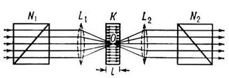 Рисунок 1.4 - Схема наблюдения хроматической поляризации в сходящихся лучах (N1 - поляризатор, N2 - анализатор; К - пластинка толщиной l, вырезанная из одноосного двулучепреломляющего кристалла параллельно его оптической оси; L1, L2 - линзы)