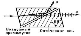 ный. Для того чтобы один из лучей претерпевал на границе раздела (склейки) полное внутреннее отражение, выбираются определённые значения преломляющих углов трёхгранных призм и, как правило, определённые ориентации оптических осей кристаллов, из которых они вырезаны. Такое отражение происходит, если углы падения лучей на поляризационную призму не превышают некоторых предельных значений, как в призмах Глана-Томсона (рисунок 2.4), Глана (рисунок 2.5), Глазебрука (рисунок 2.6), Франка-Риттера Франка-Риттера (рисунок 2.7) и др.