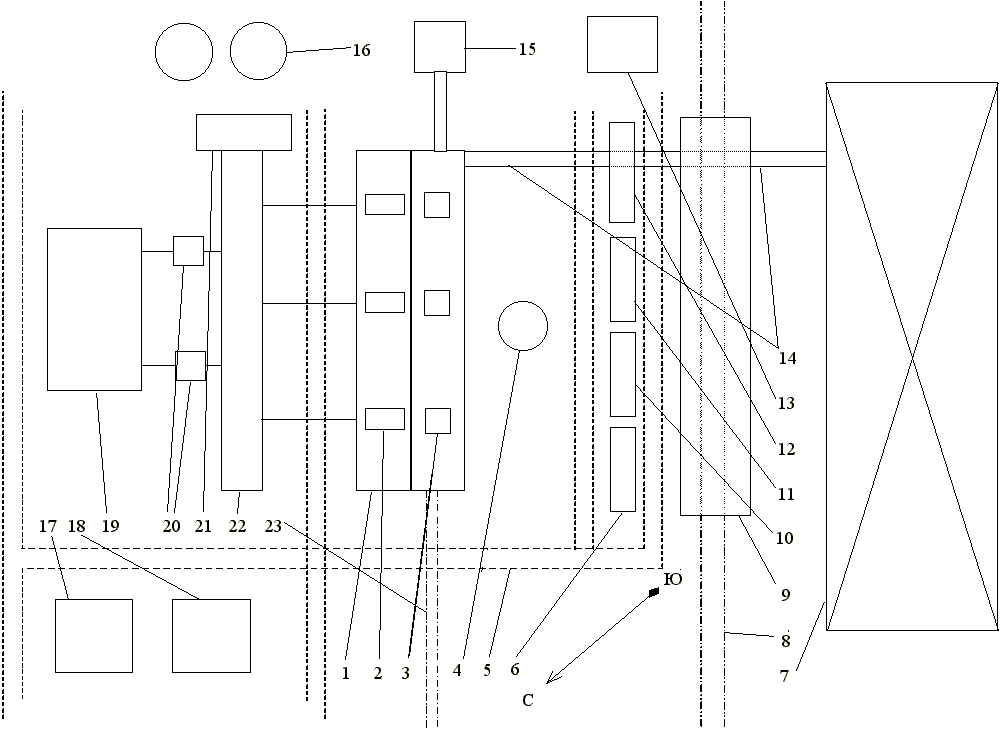 1.3. Компоновка главного здания Главное здание станции рекомендуется располагать возможно ближе к источнику водоснабжения. В зависимости от мощности станции и рельефа местности распределительное устройство обычно располагают за угольным складом или со стороны постоянного торца главного корпуса. Здания и сооружения, к которым должны подаваться железнодорожные, желательно располагать с максимальным приближением к железнодорожным путям. Ввод постоянных железнодорожных путей на площадку может быть осуществлён со стороны как временного, так и постоянного торца главного корпуса. Постоянный железнодорожный путь обязательно подводится к машинному отделению главного корпуса. [1] В состав главного здания входят: котельное и турбинное отделение и многоэтажное промежуточное помещение, включающее совмещенную бункерную и деаэраторную этажерку. Служебные помещения выполняются в виде отдельного здания, соединяемого с главным переходным мостиком на уровне основной отметки обслуживания. Оборудование пылеприготовления, звено тракта топливоподачи размещаются в промежуточном помещении. Здесь же располагаются деаэраторы, блочные защиты управления и распределительное устройство 10 кВ. Основные площадки обслуживания и блочные защиты расположены на одной отметке. Котельные агрегаты развернуты хвостовыми газоходами к дымовым трубам. Тяжелое оборудование и вращающие механизмы большой мощности размещаются на нулевых и низких отметках. Расположение распределительного устройства собственных нужд выбирается так, чтобы длина кабелей была минимальной. Турбинное и котельное отделения размещены параллельно друг другу. При этом котельное отделение может иметь разные компоновки: закрытую без связи конструкции здания с каркасом котла; закрытую с опиранием конструкций стены на каркас котла; полуоткрытую с опиранием кровли (шатра) на каркас котла (при этом стена котла совмещена с наружной стеной котельной); закрытую с подвесным котлом; открытую с установкой котла на открытом воздухе. Турбины в машинном зале располагаются поперечно. Котельное отделение имеет большую высоту, чем турбинное, но перекрытие в нем выполняется только на основной отметке обслуживания. Машинный зал по высоте делится на два помещения. В верхнем располагаются турбины, в нижнем - конденсаторы, и вспомогательное оборудование, внутри и вокруг фундаментной рамы турбоагрегата. Подземное хозяйство главного корпуса включает в себя фундаменты под здание и оборудование, и конструкции для прокладки коммуникаций. Межэтажные перекрытия выполняются из сборных крупнопанельных плит. 2. Тепломеханическая часть 2.1. Принципиальная тепловая схема электрической станции Принципиальная тепловая схема характеризует сущность основного технологического процесса преобразования и использования энергии рабочего тела электростанции. На паротурбинной электрической станции эта схема включает: котельный и турбинный агрегаты с электрическим генератором и конденсатором. Принципиальная тепловая схема включает также насосы для перекачки рабочего тела (теплоносителя), как-то: питательные насосы котлов, испарителей и паропреобразователей; конденсатные насосы турбин, регенеративных подогревателей. [2] Основное и вспомогательное тепловое оборудование объединяется в принципиальн