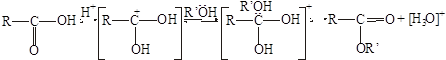 Сложные эфиры широко распространены в природе. Аромат многих цветов, плодов, ягод обусловлен присутствием в них сложных эфиров. Чрезвычайно распространены в растительном и животном мире относящиеся к сложным эфирам жиры. Эфиры низших одноатомных спиртов и низших кислот – летучие жидкости с приятным запахом цветов, ягод. Этилформиат имеет запах рома, изоамилацетат – запах груш, этилбутират – запах абрикосов, изоамилбутират – запах ананасов, бензилацетат – запах жасмина и др. Из-за их запаха эти эфиры используются в парфюмерной и пищевой промышленности как «фруктовые эссенции». Эти эфиры мало растворимы в воде, хорошо растворяются в органических растворителях, сами являются растворителями. Температуры кипения сложных эфиров ниже, чем у соответствующих кислот, так как им не присуща ассоциация. Важнейший способ получения сложных эфиров – взаимодействие карбоновых кислот со спиртами – реакция этерификации. RCOOH + R’OH ↔ RCOOR’ + H2O. В качестве катализаторов применяют конц. H2SO4 , газообразный HCl, BF3 и др. Влияние кислотного катализатора заключается в протонировании карбонильного кислорода и, следовательно, в увеличении положительного заряда на атоме углерода карбоксильной группы, что делает его более способным к присоединению нуклеофильного реагента – спирта: