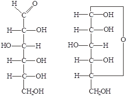 8. Спиртовое брожение. Эта реакция характерна для гексоз. Она осуществляется с помощью биологических катализаторов – ферментов. При сбраживании гексозы превращаются в этиловый спирт. Для пентоз брожение не характерно. C6H12O6 → 2CO2 + 2C2H5OH Наличие неразветвленной цепи углеродных атомов в глюкозе вытекает из ее превращения под действием иодоводорода в 2-иодгексан с нормальной цепью углеродных атомов (2). Образование в результате ацилирования (3) и алкилирования (5) соответственно пентаацетил- и пентаметилглюкозы также доказывает существование в глюкозе пяти гидроксогрупп. В конце прошлого столетия в классических работах Э.Фишера была установлена конфигурация природной глюкозы, выражаемая следующей проекционной формулой (см. рис. 2). Однако некоторые свойства моносахаридов не могут быть объяснены формулой альдегидоспирта. Так глюкоза вступает не во все реакции, характерные для альдегидов. Свойства глюкозы, которые не могут быть объяснены при рассмотрении альдегидной формулы глюкозы, находят свое объяснение, если придать ей циклическую формулу. Эту форму называют также окисной, или полуацетальной. Эта форма является таутомерной модификацией, находящейся в равновесии с альдегидной формой.