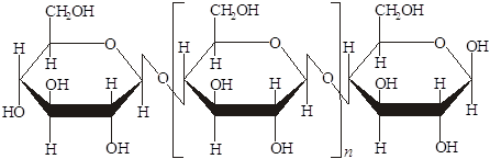 По данным рентгеноструктурного анализа, молекула амилозы свернута в спираль. Внутри спиралевой молекулы остается канал диаметром около 0,5 нм, в котором могут располагаться подходящие по размеру молекулы, образуя особого типа комплексы – так называемые соединения включения. Одним из них является упомянутое ранее соединение амилозы с йодом синего цвета. Молекула аминопектина, в отличие от амилозы, имеет разветвленное строение, приближающееся к шарообразной форме. Определенная физическими методами молекулярная масса амилопектина имеет величину порядка 10 - это значит, что степень полимеризации равна примерно 6000. Подвергая крахмал гидролизу кислотами, можно получить глюкозу в виде чистого кристаллического препарата или в виде патоки – окрашенного некристаллизующегося сиропа. Наибольшее значение крахмал имеет в качестве пищевого продукта: в виде хлеба, картофеля, круп, являясь главным источником углеводов в нашем рационе питания. Значительные количества крахмала употребляются для проклеивания (шлихтования) тканей, склеивания бумаги и картона, производства канцелярского декстринового клея. В аналитической химии крахмал служит индикатором в йодометрическом методе титрования. Целлюлоза представляет собой полисахарид, построенный из глюкозных звеньев. Ее строение напоминает строение амилозы, т.е. она тоже состоит из остатков глюкозы, но связаны они между собой β-гликозидными связями, а не α-гликозидными, как в амилозе.