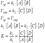 Правило Вант-Гоффа является приближенным и применимо лишь для ориентировочной оценки влияния температуры на скорость реакции. Изменение скорости под действием температуры связано с тем, что неактивные молекулы превращаются в активные, обладающие энергией для осуществления данной реакции. Эта энергия называется энергией активации. Другой способ регулирования скорости – применение катализаторов. Катализаторы – вещества, которые ускоряют химическую реакцию путем многократного участия в промежуточном химическом взаимодействии с реагентами, но после каждого цикла восстанавливающие свой химический состав. Различают положительные катализаторы, которые ускоряют реакцию, и отрицательные катализаторы (ингибиторы), замедляющие ее. Ускоряющее действие катализаторов заключается в уменьшении энергии активации. Различают два вида катализа: гетерогенный (1) – катализатор и реагирующие вещества находятся в разных фазах, и гомогенный (2) – катализатор и вещества находятся в одной фазе: 1. MnO2 + 4HCl → MnCl2 + Cl2 + 2H2O 2NO2 + 2SO2 → 2SO2 + 2NO. Обратимость химических реакций. Химическое равновесие и условия, которые влияют на смещение химического равновесия.Химическая реакция – процесс, при котором из одних веществ получаются другие. Как известно, по признаку процесса различают несколько типов реакций: разложения, замещения и т. д. По характеру обратимости реакции делятся на обратимые и необратимые. Реакции, протекающие в одном направлении и приводящие к полному превращению исходных веществ в продукты реакции, называются необратимыми: K2CO3 + 2HCl → 2KCl + CO2 + H2O. Обратимыми называются реакции, которые одновременно идут в двух взаимно противоположных направлениях: слева направо – прямая, справа налево – обратная. Обе реакции идут с определенной скоростью. В ходе обратимой реакции концентрация исходных веществ уменьшается, а концентрация продуктов реакции увеличивается. Соответственно скорость прямой реакции будет уменьшаться, а обратной – увеличиваться до тех пор, пока эти скорости не станут равными. Состояние системы, при котором скорость прямой реакции равна скорости обратной, называется химическим равновесием. При состоянии химического равновесия реакция не прекращается, а обе реакции идут с равными скоростями Выразим скорости прямой и обратной реакций: