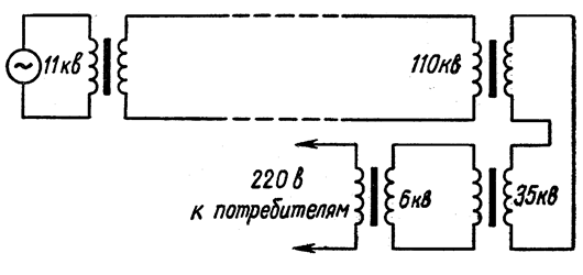 Рис. 3. Действие трансформатора основано на явлении электромагнитной индукции. При прохождении переменного тока по первичной обмотке в железном сердечнике появляется переменный магнитный поток, который возбуждает ЭДС индукции в каждой обмотке. Причем мгновенное значение ЭДС индукции е в любом витке первичной или вторичной обмотки согласно закону Фарадея определяется формулой: е = - Δ Ф/ Δ t Если Ф = Ф0 соsωt, то е = ω Ф0 sinωt, или е = E0 sinωt , где E0= ω Ф0 - амплитуда ЭДС в одном витке. В первичной обмотке, имеющей п1 витков, полная ЭДС индукции e1 равна п1е. Во вторичной обмотке полная ЭДС. е2 равна п2е, где п2 - число витков этой обмотки. Отсюда следует, что e1 е2 = п1 п2. (1) Сумма напряжения u1, приложенного к первичной обмотке, и ЭДС e1 должна равняться падению напряжения в первичной обмотке: u1 + e1 = i1 R1, где R1 - активное сопротивление обмотки, а i1 - сила тока в ней. Данное уравнение непосредственно вытекает из общего уравнения. Обычно активное сопротивление обмотки мало и членом i1 R1 можно пренебречь. Поэтому u1 ≈ - e1. (2) При разомкнутой вторичной обмотке трансформатора ток в ней не течет, и имеет место соотношение: u2 ≈ - e2. (3) Так как мгновенные значения ЭДС e1 и e2 изменяются синфазно, то их отношение в формуле (1) можно заменить отношением действующих значений E1 и E2 этих ЭДС или, учитывая равенства (2) и (3), отношением действующих значений напряжений U1 и U2. U1/U2 = E1/E2 = n1/ n2= k. (4) Величина k называется коэффициентом трансформации. Если k>1, то трансформатор является понижающим, при k<1 - повышающим. При замыкании цепи вторичной обмотки в ней течет ток. Тогда соотношение u2 ≈ - e2 уже не выполняется точно, и соответственно связь между U1 и U2 становится более сложной, чем в уравнении (4). Согласно закону сохранения энергии, мощность в первичной цепи должна равняться мощности во вторичной цепи: U1I1 = U2I2, (5) где I1 и I2 — действующие значения силы в первичной и вторичной обмотках. Отсюда следует, что U1/U2 = I1/I2 . (6) Это означает, что, повышая с помощью трансформатора напряжение в несколько раз, мы во столько же раз уменьшаем силу тока (и наоборот). Вследствие неизбежных потерь энергии на выделение тепла в обмотках и железном сердечнике уравнения (5) и (6) выполняются приближенно. Однако в современных мощных трансформаторах суммарные потери не превышают 2—3%. В житейской практике часто приходится иметь дело с трансформаторами. Кроме тех трансформаторов, которыми мы пользуемся волей-неволей из-за того, что промышленные приборы рассчитаны на одно напряжение, а в городской сети используется другое, — кроме них приходится иметь дело с бобинами автомобиля. Бобина — это повышающий трансформатор. Для создания искры, поджигающей рабочую смесь, требуется высокое напряжение, которое мы и получаем от аккумулятора автомобиля, предварительно превратив постоянный ток аккумулятора в переменный с помощью прерывателя. Нетрудно сообразить, что с точностью до потерь энергии, идущей на нагревание трансформатора, при повышении напряжения уменьшается сила тока, и наоборот. Для сварочных аппаратов требуются понижающие трансформаторы. Для сварки нужны очень сильные токи, и трансформатор сварочного аппарата имеет всего лишь один выходной виток. Вы, наверное, обращали внимание, что сердечник трансформатора изготовляют из тонких листиков стали. Это сделано для того, чтобы не терять энергии при преобразовании напряж