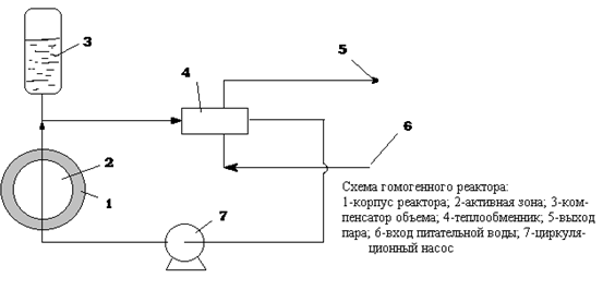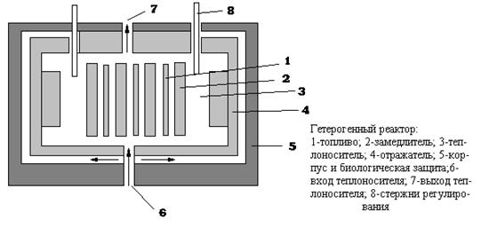 В настоящее время для энергетических целей проектируют только гетерогенные реакторы. Ядерное топливо в таком реакторе может использоваться в газообразном, жидком и твердом состояниях. Однако, сейчас гетерогенные реакторы работают только на твердом топливе. В зависимости от замедляющего вещества гетерогенные реакторы делятся на графитовые, легко водяные, тяжеловодные и органические. По виду теплоносителя гетерогенные реакторы бывают легко водяные, тяжеловодные, газовые и жидкометаллические. Жидкие теплоносители внутри реактора могут быть в однофазном и двухфазном состояниях. В первом случае теплоноситель внутри реактора не кипит, а во втором - кипит. Реакторы, в активной зоне которых температура жидкого теплоносителя ниже температуры кипения, называются реакторами с водой под давлением, а реакторы, внутри которых происходит кипение теплоносителя, - кипящими. В зависимости от используемого замедлителя и теплоносителя гетерогенные реакторы выполняются по разным схемам. В России основные типы ядерных энергетических реакторов - водо-водяные и водографитовые. По конструктивному исполнению реакторы подразделяются на корпусные и канальные. В корпусных реакторах давление теплоносителя несет корпус. Внутри корпуса реактора течет общий поток теплоносителя. В канальных реакторах теплоноситель подводится к каждому каналу с топливной сборкой раздельно. Корпус реактора не нагружен давлением теплоносителя, это давление несет каждый отдельный канал. В зависимости от назначения ядерные реакторы бывают энергетические, конверторы и раз множители, исследовательские и многоцелевые, транспортные и промышленные. Ядерные энергетические реакторы используются для выработки электроэнергии на атомных электростанциях, в судовых энергетических установках, на атомных теплоэлектроцентралях (АТЭЦ), а также на атомных станциях теплоснабжения (АСТ). Реакторы, предназначенные для производства вторичного ядерного топлива из природного урана и тория, называются конверторами или раз множителями. В реакторе - конверторе вторичного ядерного топлива образуется меньше первоначально израсходованного. В реакторе - раз множителе осуществляется расширенное воспроизводство ядерного топлива, т.е. его получается больше, чем было затрачено. Исследовательские реакторы служат для исследований процессов взаимодействия нейтронов с веществом, изучения поведения реакторных материалов в интенсивных полях нейтронного и гамма-излучений, радиохимических и биологических исследований, производства изотопов, экспериментального исследования физики ядерных реакторов. Реакторы имеют различную мощность, стационарный или импульсный режим работы. Наибольшее распространение получили водо-водяные исследовательские реакторы на обогащенном уране. Тепловая мощность исследовательских реакторов колеблется в широком диапазоне и достигает нескольких тысяч киловатт. Многоцелевыми называются реакторы, служащие для нескольких целей, например, для выработки энергии и получения ядерного топлива. Ядерный реактор в подкритическом режиме как усилитель энергии. Представим себе, что мы собрали атомный реактор, имеющий эффективный коэффициент размножения нейтронов kэф немного меньше единицы. Облучим это устройство постоянным внешним потоком нейтронов N0. Тог