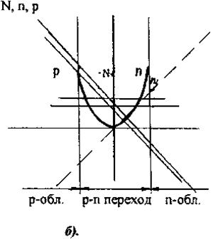Рисунок 1.1 Распределение примеси и носителей заряда в полупроводнике при изменении типа проводимости: (а) плавное изменение типа проводимости; (б) резкое изменение типа проводимости. Для компенсации диффузионных токов достаточно незначительного нарушения нейтральности, и условие (1.1.1) можно считать приближенно выполненным. Условие электронейтральности свидетельствует о том, что в однородном полупроводнике независимо от характера и скорости образования носителей заряда в условиях как равновесной, так и не равновесной концентрации не могут иметь место существенные объемные заряды в течении времени, большего (3-5)τε (τε≈10-12 с), за исключением участков малой протяжённости: