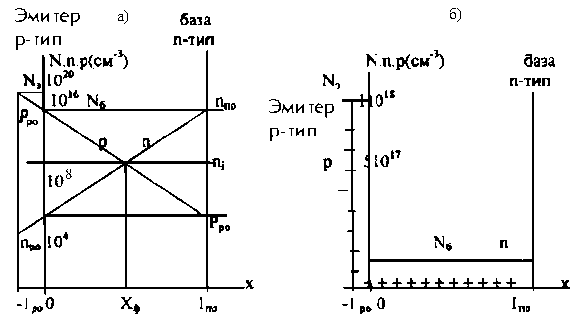 Рисунок 1.2 соответствует кремниевому переходу (ni ≈ 1010 см-3 ) при комнатной температуре (Т=290К) с концентрацией примеси Рисунок 1.2 Распределение примеси и носителей заряда в ступенчатом P-N переходе: (а)- полулогарифмический масштаб; (б)- линейный масштаб. В глубине эмиттера и базы концентрация основных носителей заряда практически совпадает с результирующей концентрацией примеси: pро =Nэ, nnо=NБ, (1.2.1) а концентрация не основных носителей определяется законом действующих масс: nр0=ni/pр0=ni/Nэ (1.2.2.а) pn0=ni/nn0=ni/NБ (1.2.2.б) Индексы «p» и «n» соответствуют p- и n-областям, а индекс «0» соответствует состоянию термодинамического равновесия. Следует отметить, что концентрация не основных носителей в базе больше чем в эмиттере (а при Nэ>>NБ много больше). На рис. 1.2.а распределение примесей и носителей заряда представлено в полулогарифмическом масштабе. Переход занимает область –lр0 < x < ln0. Конечно границы перехода x=-lp0 и x=ln0 определены в некоторой степени условно, так как концентрация основных носителей изменяется плавно. Тем не менее, из рисунка видно, что уже на небольшом расстоянии от границ внутри перехода выполняется равенство: P<<Nэ, (1.2.3) n<<NБ. Неравенства (1.2.3) выполняется во всем p-n-переходе. На рис. 1.2.б распределение концентрации носителей и примесей заряда изображены в линейном масштабе. Из рисунка видно, что в эмиттерной области перехода (-lp0<x<0) концентрация подвижных носителей очень мала по сравнению с концентрацией примеси. Эта область имеет отрицательный объемный заряд, плотность которого не зависит от координаты: рэ = -lNэ. В базовой области перехода (0<x<lno) плотность объемного заряда положительна: pБ=lNб. Для n-области основными носителями являются электроны, для p-области дырки. Основные носители возникают почти целиком вследствие ионизации донорных и акцепторных примесей. Помимо основных носителей эти области содержат неосновные носители: n-область - дырки (pno), p-область –электроны (nро). Их концентрацию можно определить, пользуясь законом действующих масс: nno∙Pno=pno∙nno=ni2. При nno=ppo=1022 м-3 и ni=1019 м-3 (для Ge) получаем pno=nро=1016 м. Таким образом, концентрация дырок в p-области на шесть порядков выше концентрации их в n-области, точно также концентрация электронов в n-области на шесть порядков выше их концентрации в p-области. Т.к. концентрация дырок в области p выше, чем в области n, то часть дырок в результате диффузии перейдет в n- область, где в близи границы окажутся избыточные дырки, которые будут рекомбинировать с электронами. Соответственно в этой зоне уменьшается концентрация свободных электронов, и образуются области нескомпенсированных положительных ионов донорных примесей. В p-области уход дырок из граничного слоя способствует образованию областей с нескомпенсированными отрицательными зарядами акцепторных примесей, созданными ионами. Подобным же образом происходит диффузионное перемещение электронов из n-слоя в p-слой. Однако в связи с малой концентрацией электронов по сравнению с концентрацией дырок перемещением основных носителей заряда высокоомной области в первом приближении пренебрегают. Перемещение происходит до тех пор, пока уровни Ферми обоих слоев не уравняются [4].
